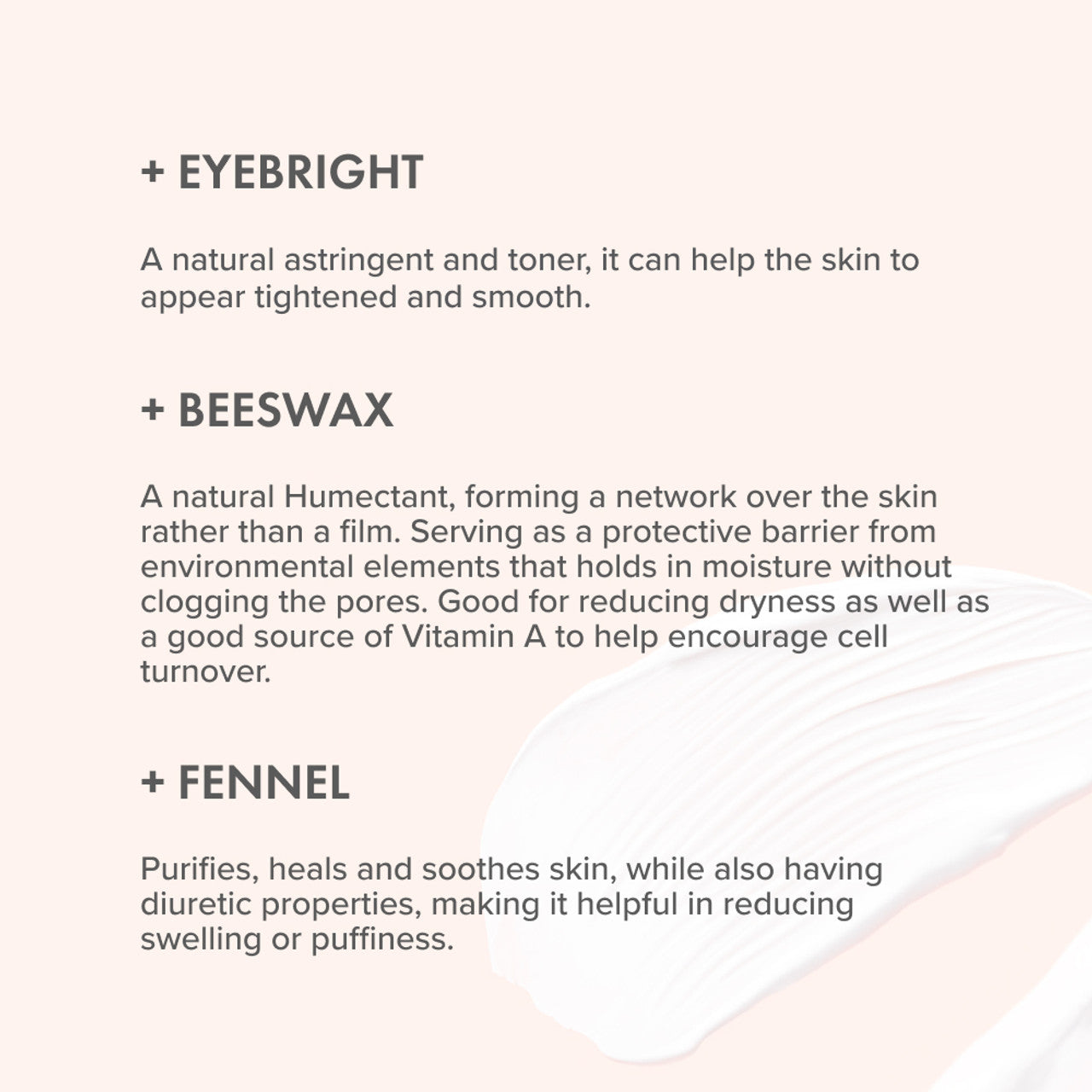 Euphrasia Officinalis (Eyebright) Extract is a clinically endorsed botanical, specifically chosen for its remarkable ability to soothe the eye area. Renowned for reducing puffiness and diminishing dark circles.